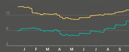 Así evolucionan este año las previsiones de beneficios empresariales, la UE en azul y USA en amarillo: