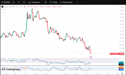 La proporción de precio oro/plata sigue bajando debido a que la plata está subiendo más rápido de lo que sube el oro. Ha bajado desde 81 el lunes 06/10 a 79 hoy. Las estimaciones dicen que su punto de equilibrio podría estar en torno a 60-65. Si esto se cumple, a la plata aún le queda bastante subida, y si el oro sigue subiendo, la debería seguir arrastrando al alza.