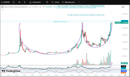 Ahora está a 51.95 $/oz y la figura parece haberse completado. Según el análisis técnico, en el 79 % de los casos, la ruptura de una figura en taza con asa es alcista. Debería producirse un gran movimiento al alza en los próximos meses, es decir, una larga continuación de lo que ya estamos viendo, por la relevancia y solidez psicológica que implica una consolidación tan extensa (casi 50 años). A mí gráficamente me sale un objetivo de 91 ¿estoy loco?