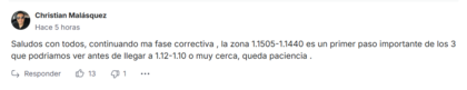 En el foro de Investing EURUSD hay un elliotista peruano llamado Christian Malásquez que dice que trabaja en una agencia de inversiones y que ya ha acertado en movimientos a largo plazo. Por ejemplo, en un artículo suyo en Investing de octubre de 2024 con DXY a 102 y EURUSD a 1.09 lo anunció: "Si esta tendencia se confirma y la victoria republicana se materializa, podríamos ver un ascenso del índice dólar  a la zona 107.50 -109.00 antes de  una importante caída". Se ha cumplido: el DXY tocó 110 en enero de 2025 y en septiembre de 2025 había caído a 96.3. Luego, en enero de 2025, cuando el par estaba a 1.02 y mucha gente hablaba de vuelta a la paridad, predijo el cambio de tendencia con un objetivo de 1.18 y apostó por ese objetivo final con tres largos escalonados. Casi nadie lo creyó al principio e incluso se rieron de él, pero Malásquez detalló sus objetivos intermedios con sus apuestas largas que se fueron cumpliendo. Ahora muchos tienen en cuenta su opinión y se le trata con mucho respeto.  El tipo es educado y prudente, pues siempre habla de posibilidades, nunca de certezas. Pues bien, Malásquez ha dicho esto: