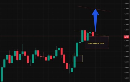 Puedes apreciar como actualmente la cotización se encuentra en un rango de resistencia que señalo en línea discontinua alcista, y otro rectángulo naranja en la que puede darse zona correctiva previa hasta el nivel 1,11 - 1,10 aprox sin desvirtuar la señal activa. Ruptura al alza por encima de los 1,17 daría proyección hacia esos 1,25 - 1,26 fortaleciendo al Euro frente al USD.