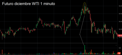 En el crudo siguen capando los intentos de rebote con entradas de fuerte volumen pero tampoco nada del otrísimo mundo, lo que me indica que no hay un interés real, aún, de subirlo. Porque cuando quiere subir, no hay volumen que lo pare. Para muesta un botón de hace poco rato, 9:56, el último máximo relativo: