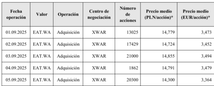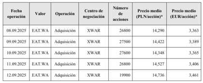 AmRest comunica que, durante el periodo transcurrido entre el 1 y el 5 de septiembre de 2025 (ambos incluidos), la Sociedad ha llevado a cabo las operaciones que se detallan a continuación sobre sus propias acciones al amparo del Programa de Recompra.