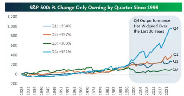 El desempeño superior del S&P 500 en el cuarto trimestre “realmente solo comenzó a ampliarse en los últimos 30 años”, descubrió Bespoke, como se destaca en el gráfico a continuación.