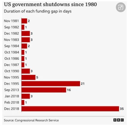 Mientras continúa el enfrentamiento entre republicanos y demócratas, es mejor tener una idea de cuánto durará este tira y afloja. Cabe recordar que este es el primer cierre gubernamental desde 2018/19. La mayoría de las veces, este contratiempo suele durar solo unos días, ya que a los políticos les encanta jugar al gallito. Pero, en cualquier caso, hay consecuencias reales para los mercados .