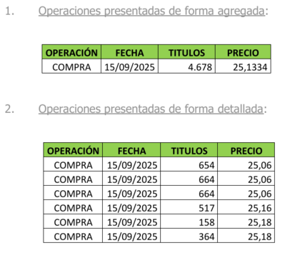 En ejecución del Programa de Recompra de acciones propias de la Sociedad destinado a implementar el plan global de compra incentivada de acciones para empleados de Fluidra, publicado mediante la comunicación de Otra Información Relevante de fecha 12 de julio de 2023 con número de registro 23562 y prorrogado mediante la comunicación de Otra Información Relevante de fecha 30 de octubre de 2024 con número de registro 31129, con el fin de dar cumplimiento a lo establecido en el artículo 2 del Reglamento Delegado (UE) 2016/1052 de la Comisión, de 8 de marzo de 2016, se informa de que en la Fecha de Adquisición correspondiente al mes de agosto de 2025 (15 de agosto de 2025), se han llevado a cabo las operaciones que figuran a continuación, todas ellas realizadas en Bolsas y Mercados españoles: