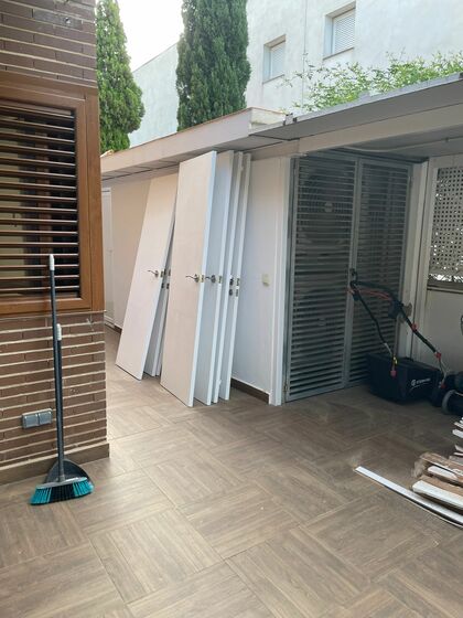 A mitad de junio nos llegan a casa sin previo aviso todos los marcos de las puertas. Nos descoloca un poco porque del resto del pedido no hay noticias, pero entendemos que las puertas están al caer. Lo que no sabíamos es que nos íbamos a convertir en almacén logístico de Leroy durante meses.