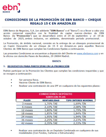 Un cheque regalo de amazon de 15 euros por el que además de tener que contratar un depósito normal, tienes que contratar otro depósito combinado según los requisitos de la promoción (lo ponen debajo del cuadro para que se vea menos). 🧐