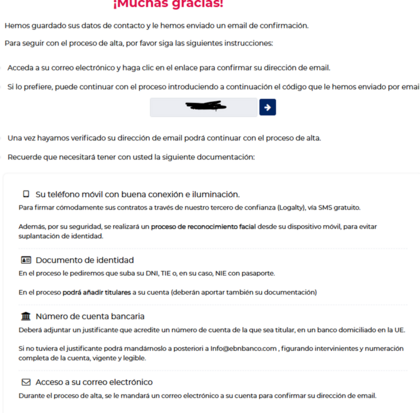 Estoy en la primera parte del proceso, esperando que revisen y me envien claves (cosa que puede tardar porque estan un poco saturados. He seguido la guia que puso @tesauro de su alta. La he modificado, ya que en esta primera parte del proceso no he tenido las mismas incidencias: (1) Inicio por PC con cámara el comienzo del alta online mediante el enlace siguiente 👇 https://acceso.ebnbanco.com/onboarding/cuenta-remunerada Cuenta que será la base para recibir el capital y los intereses del Depósito al 4% que será constituido una vez activada.