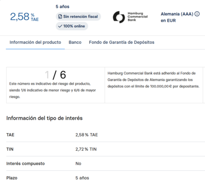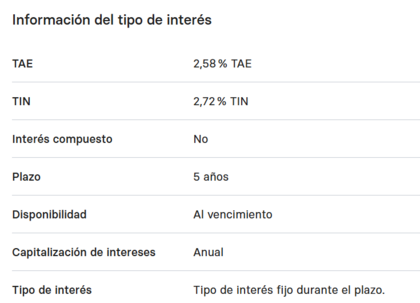 Ahora en Raisin España lo ponen bien y diferencian entre TAE y TIN, pero por ejemplo este de 5 años cuando salió lo ponían con el TAE y TIN igual al 2,80%, cosa que no es posible porque por lo que parece no es compuesto.
