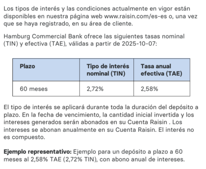 De todas formas veo que en la hoja informativa de Hamburg Bank, pone que los intereses los ingresan anualmente en la cuenta de Raisin, pero antes han dicho que el principal y los intereses se abonan en la cuenta de Raisin al vencimiento. En el mismo párrafo dicen una cosa y la contraria a la vez.