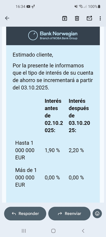 Teniendo en cuenta que se acerca final de año, el cobro de intereses, y que suelen moverse en estas fechas, no descartaría por su parte de aquí a final de año alguna subida y que se acercaran a un 2,35 - 2,40. Entre los 4 meses de Pibnk, los 3 de Zetelm y ahora otros 4 de Openbnk con las bajadas de la cuenta plus les han adelantado por la derecha y encima bancos españoles.