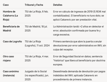 El TS ha reiterado esta improcedencia de reintegros en sentencias de 2024 y 2025, aplicándola a prestaciones sociales en general, y recientemente el TSJ la han extendido también al IMV e incluso el Defensor del Pueblo ha instado a la Seguridad Social a perdonar devoluciones en casos de error administrativo, alineándose con esta línea. Los casos más relevantes en España han sido los siguientes: