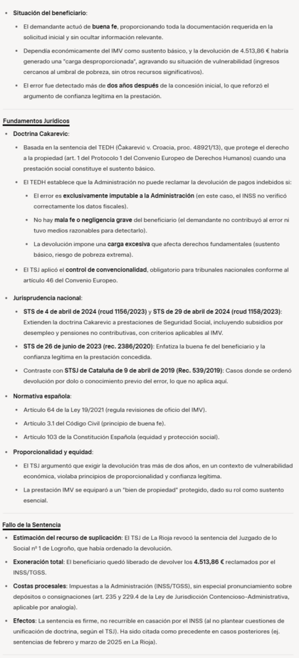 El TSJ de La Rioja falló estimando la réplica del demandante, desestimando la reclamación del INSS/TGSS y exonerando totalmente al demandante de dicha devolución de cerca de 4500 euros y cargando las costas a la Administración; se basó en la doctrina Cakarevic, la buena fé del beneficiario ya que no contribuyo al error en medida alguna, que la devolución agravaría la vulnerabilidad económica del citado beneficiario del IMV y se hizo referencia a jurisprudencia nacional previa como la STS de 4 de abril de 2024 (rcud. 1156/2023) y STS de 29 de abril de 2024 (rcud. 1158/2023), que extienden la doctrina a prestaciones de Seguridad Social. Hay un buen resumen a continuación 👇