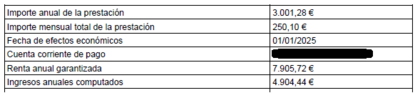 No me deja editar el mensaje anterior, así que siento ser tan pesada, jeje, pido perdón. Pero es que ahora intentando hacer números y revisando todo lo que me has dicho, para tenerlo digitalizado todo, en caso de acabar reclamando (que esperare a tu opinión sobre si hacerlo o no). Cierto es que no tengo carta/comunicación de los atrasos de Enero/2025 que cobre, pero si la carta de la cuantía mensual!! Y en la carta de Enero/2025 si que refleja en ingresos anuales computados 4.904€ que sería lo aproximado aplicando las deducciones correspondientes a los datos fiscales del ejercicio 2023 que eran los 5.445€:Carta Enero 2025