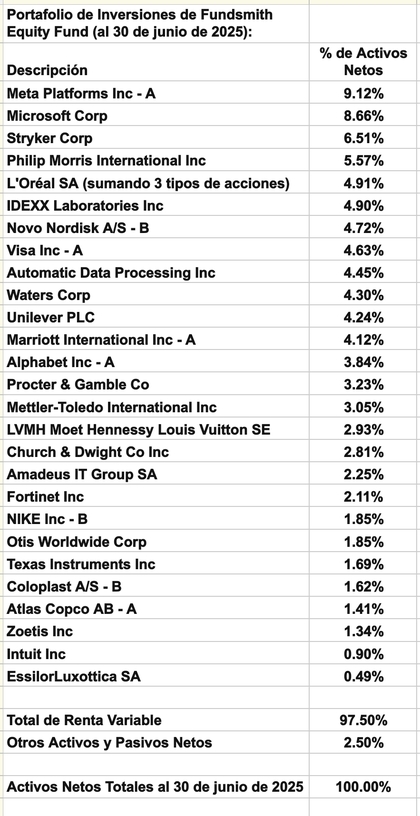 Lo que predica se materializa en las posiciones reales. Negocios de calidad, diversificación limitada, orientación global, y cero espacio para modas o apuestas especulativas. Justo lo que venden en el manual, lo ves en la cartera.