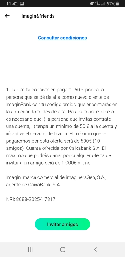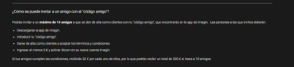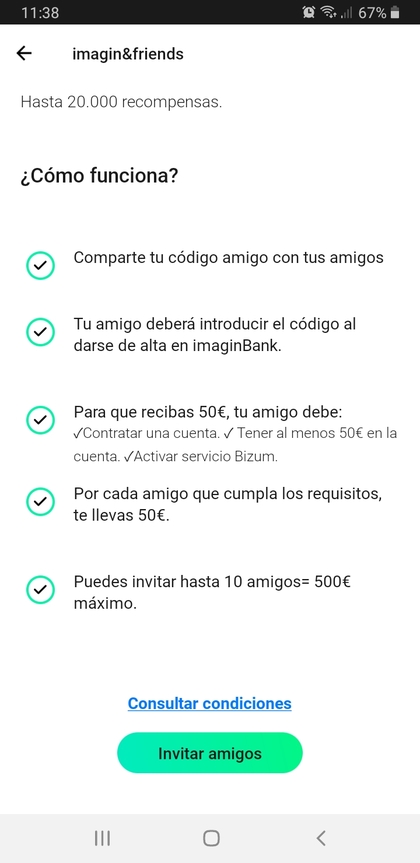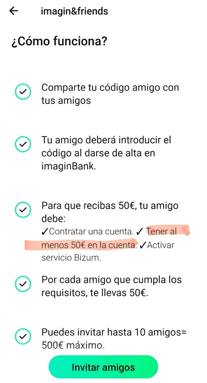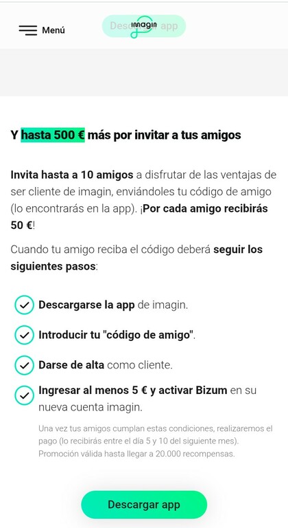 La persona a la que invites deberá descargarse la APP de Imagin. Luego deberá introducir el “código amigo” y aceptar los términos y condiciones cuando esté dando de alta la cuenta. Si no lo hace, no percibirás nada aunque cumpla con el resto de requisitos.
