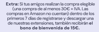 Además, si te das de alta utilizando el enlace de alguno de los compañeros de Rankia te llevarás 15€ y cuando tengas tu propio enlace conseguirás 10€ por cada nuevo invitado que cumpla las mismas condiciones. Para conseguir el bono de bienvenida debes instalar la extensión de web y realizar una primera compra de al menos 30€ + IVA (las compras de Amazon no cuentan) durante los primeros 7 días del registro.
