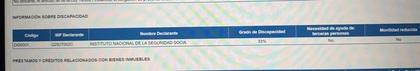 Haz una comprobación rápida, en su declaración de la renta hecha este año y que es por lo ganado el año pasado le tiene que venir en la primera hoja, junto con lo datos personales, la discapacidad, tiene que estar tachada la casilla uno en el apartado discapacidad que corresponde a una persona con discapacidad entre el 33 y 64% sin ayuda de terceras personas